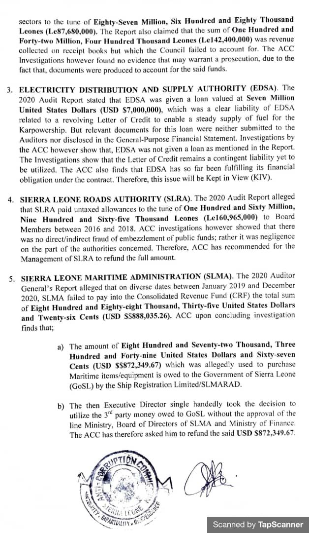 5. SIERRA LEONE MARITIME ADMINISTRATION (SLMA). The 2020 Auditor General’s Report alleged that on diverse dates between January 2019 and December 2020, SLMA failed to pay into the Consolidated Revenue Fund (CRF) the total sum of Eight Hundred and Eighty-eight Thousand, Thirty-five United States Dollars and Twenty-six Cents (USD $$888,035.26). ACC upon concluding investigation finds that;