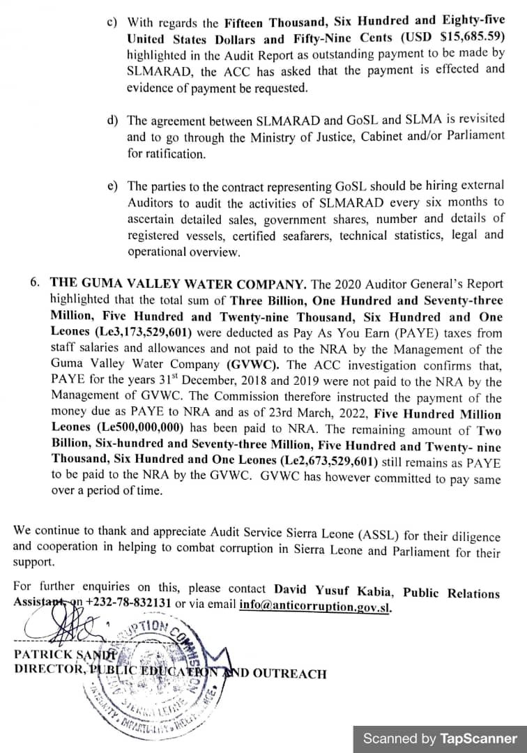 6. THE GUMA VALLEY WATER COMPANY. The 2020 Auditor General’s Report highlighted that the total sum of Three Billion, One Hundred and Seventy-three Million, Five Hundred and Twenty-nine Thousand, Six Hundred and One Leones (Le3,173,529,601) were deducted as Pay As You Earn (PAYE) taxes from staff salaries and allowances and not paid to the NRA by the Management of the Guma Valley Water Company (GVWC). The ACC investigation confirms that, PAYE for the years 31st December, 2018 and 2019 were not paid to the NRA by the Management of GVWC. The Commission therefore instructed the payment of the money due as PAYE to NRA and as of 23rd March, 2022, Five Hundred Million Leones (Le500,000,000) has been paid to NRA. The remaining amount of Two Billion, Six-hundred and Seventy-three Million, Five Hundred and Twenty- nine Thousand, Six Hundred and One Leones (Le2,673,529,601) still remains as PAYE to be paid to the NRA by the GVWC. GVWC has however committed to pay same over a period of time.